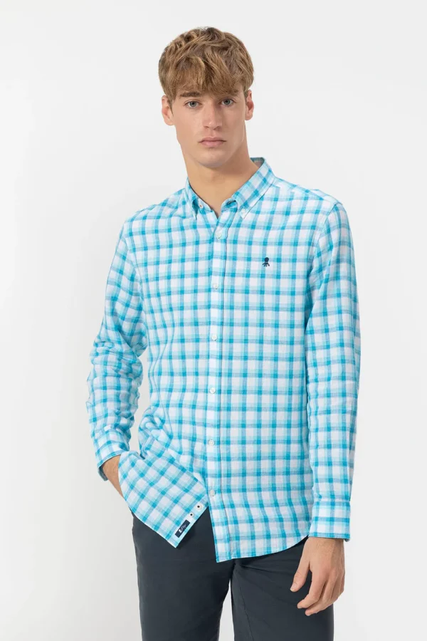 La camisa de cuadros azul de El Pulpo en lino es la opción ideal para quienes buscan frescura y estilo. Su diseño de cuadros en tonos azules aporta un toque moderno y versátil, mientras que su confección en 100% lino la hace transpirable y ligera, perfecta para climas cálidos o entretiempo.