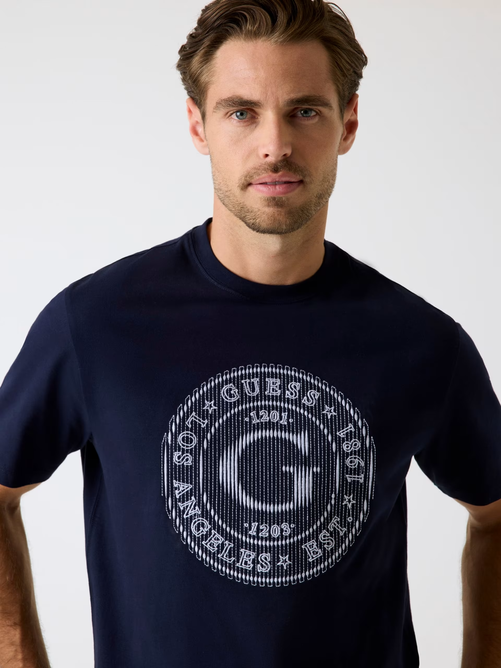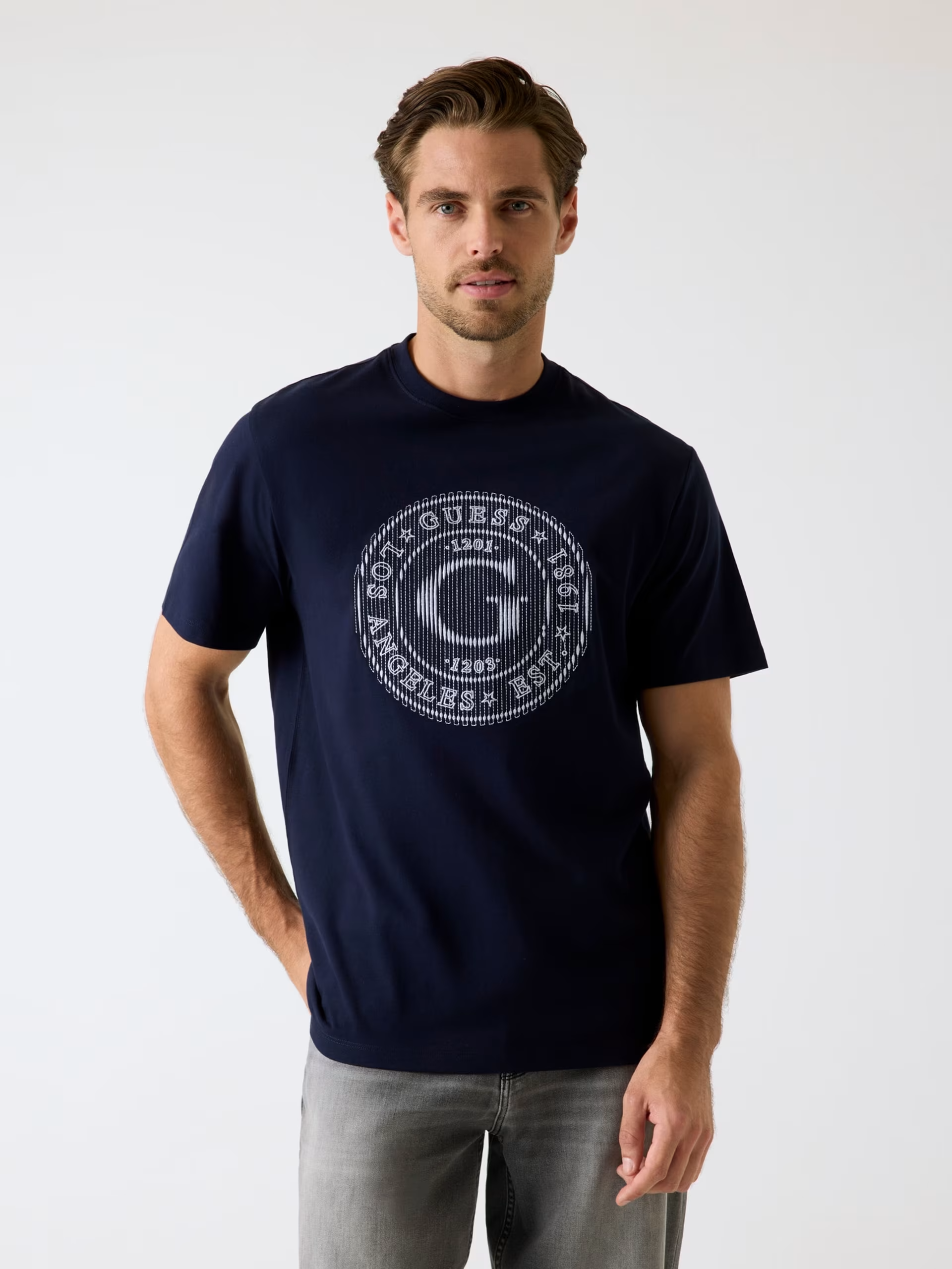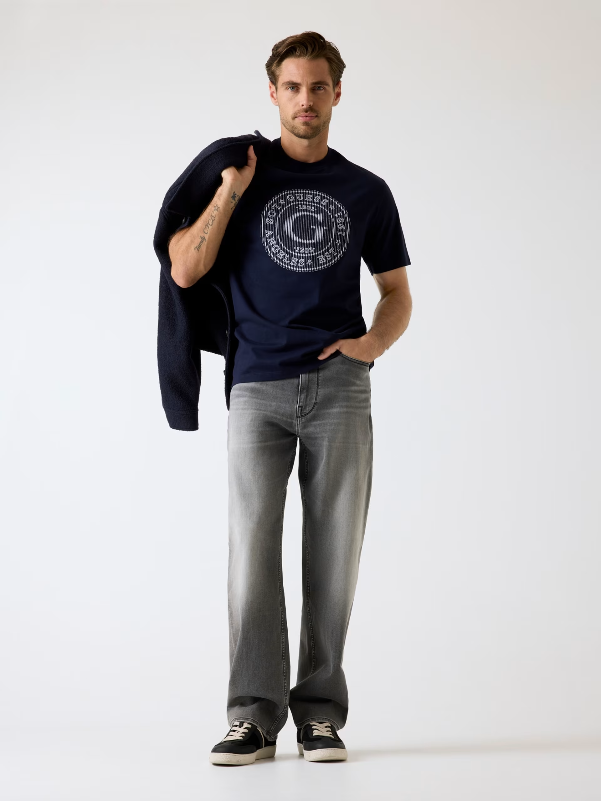 El diseño presenta un estampado circular con el logo Guess Los Angeles, aportando un toque distintivo y elegante al clásico estilo urbano. Su corte regular fit asegura una silueta equilibrada y favorecedora, ideal para quienes buscan una prenda versátil que mantenga la comodidad sin perder personalidad.