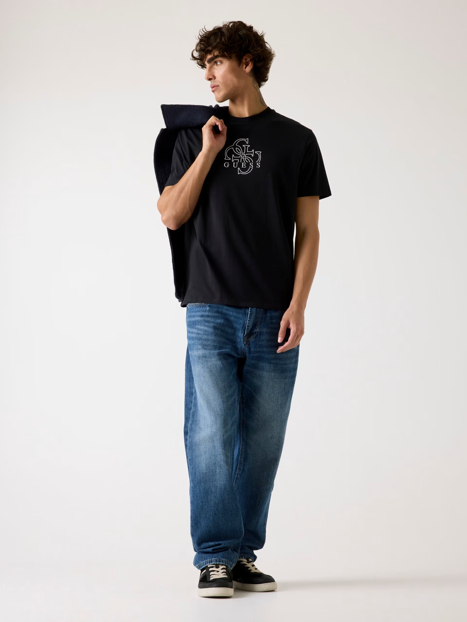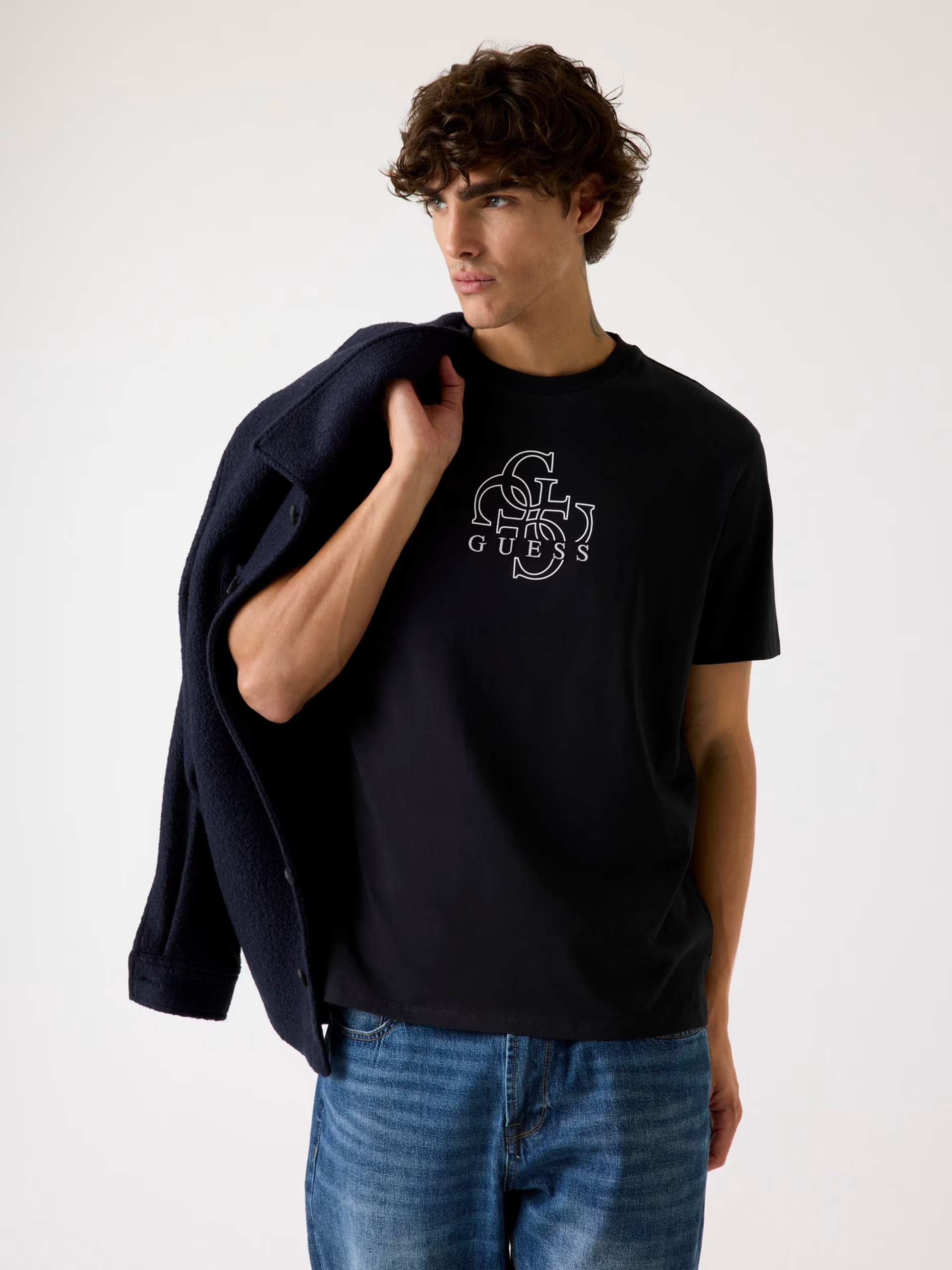 El protagonista de esta camiseta es el logo 4 G’s estampado en el pecho: una reinterpretación moderna del emblemático símbolo de Guess que combina elegancia y carácter visual. El diseño en color blanco contrasta perfectamente con el fondo negro de la prenda, aportando un toque distintivo sin caer en lo excesivo.