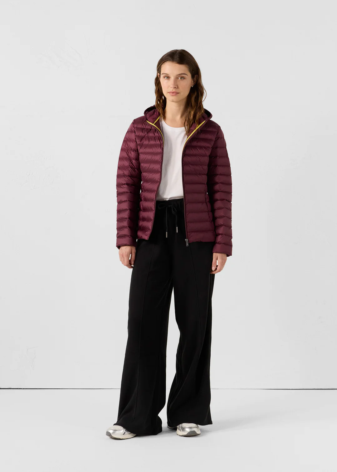 La chaqueta Jott mujer Cloe burdeos con capucha es una apuesta segura para el invierno o el entretiempo, adaptándose fácilmente a looks urbanos, casuales o más formales.
